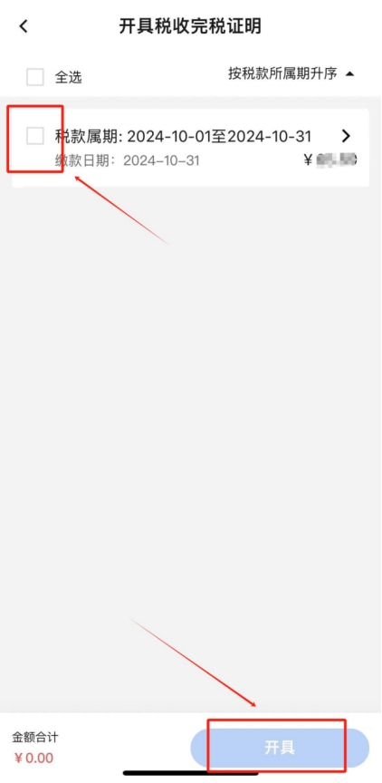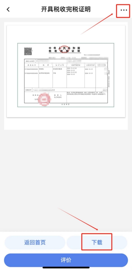 在查詢結果中勾選本次繳納的單筆稅款,點擊“開具”,即可查看并下載完稅證明(如有需要,您可點擊完稅證明預覽頁面右上角“...”將發(fā)票分享至對方)。