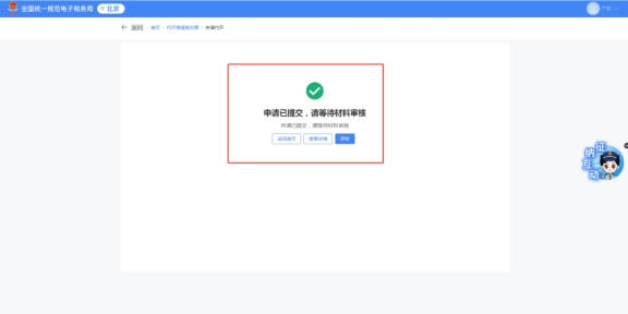 確認系統(tǒng)自動計算的應納稅費信息,無誤后點擊“提交”,顯示“提交成功”后等待稅務機關審核即可(稅務機關將在半個工作日內完成審核,屆時您可按照下方流程查看已提交的申請的審核狀態(tài)并進行后續(xù)操作)。