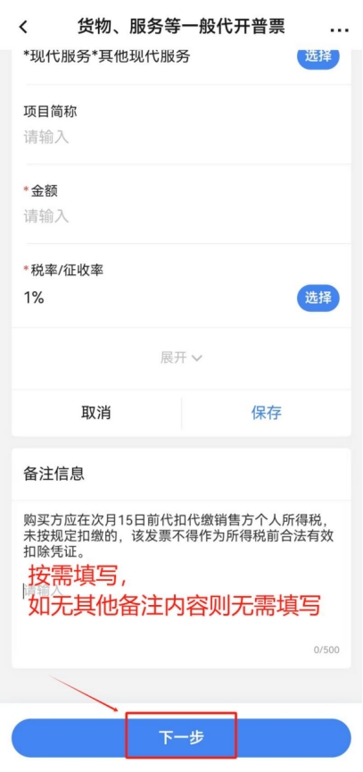 點擊“項目信息”一欄中的“添加項目信息”,“項目編號名稱”選擇“*現(xiàn)代服務*其他現(xiàn)代服務”,“項目簡稱”按需據(jù)實填寫(例如:勞務費/講課費等),“金額”據(jù)實填寫開票金額,“稅率/征收率”選擇“1%”,點擊“展開”可填寫更多信息,可根據(jù)開票需求自行選擇填寫(非必填項),填寫完成后點擊“保存”。