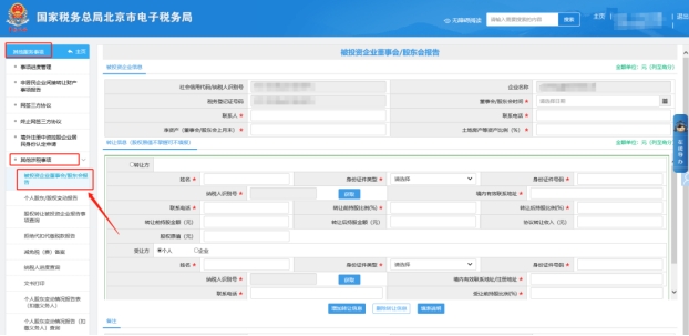 首先被投資企業(yè)登錄北京市電子稅務(wù)局備案(填寫兩張表)路徑:請您點(diǎn)擊【我要辦稅】—【其他服務(wù)事項(xiàng)】—【其他涉稅事項(xiàng)】—【被投資企業(yè)董事會(huì)/股東會(huì)報(bào)告和個(gè)人股東/股權(quán)變動(dòng)報(bào)告】;