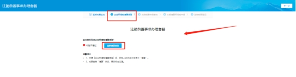 第五步:可點(diǎn)擊【我要清算申報(bào)】申報(bào)完成后,可點(diǎn)擊⑤或下一步按鈕再次進(jìn)入注銷(xiāo)預(yù)檢,對(duì)未辦結(jié)事項(xiàng)進(jìn)行檢測(cè),如果沒(méi)有未辦結(jié)事項(xiàng),則可以進(jìn)行注銷(xiāo)。