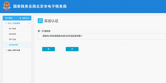 7.? 納稅人點(diǎn)擊“確定”按鈕后,進(jìn)入實(shí)名認(rèn)證界面,出現(xiàn)選擇提示“您是否已經(jīng)在稅務(wù)機(jī)關(guān)進(jìn)行過(guò)實(shí)名信息采集”,點(diǎn)擊“是”進(jìn)入關(guān)聯(lián)實(shí)名信息界面;點(diǎn)擊“否”進(jìn)入立思辰人臉識(shí)別驗(yàn)證界面;