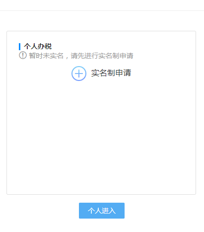 5.? 納稅人進(jìn)入實(shí)名申請(qǐng)界面,首先進(jìn)行個(gè)人辦稅實(shí)名申請(qǐng),點(diǎn)擊“個(gè)人進(jìn)入或?qū)嵜粕暾?qǐng)”按鈕。
