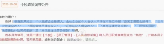 除了上文說到的個人所得稅不能長期零申報外,還有人收到了個稅調(diào)整公告:“根據(jù)政策規(guī)定,個人獨資企業(yè)投資人、合伙企業(yè)的個人合伙人不得在本單位申報"正常工資薪金所得”、"全次性獎金收入”“保險營銷員傭金收入”“證券經(jīng)紀人傭金收入”、“其他連續(xù)勞務(wù)報酬”、“一般勞務(wù)報酬”法律援助補貼勞務(wù)報酬”及“其他非連續(xù)勞務(wù)報酬”所得。