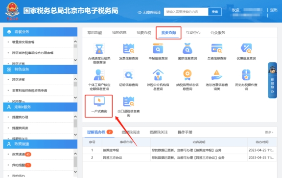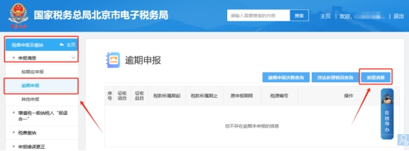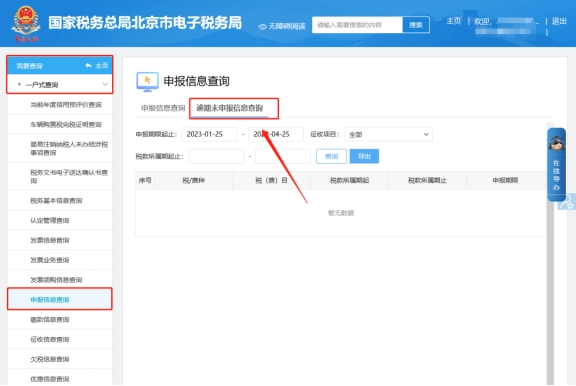 (1)請(qǐng)您選擇【我要查詢】—【一戶式查詢】—【申報(bào)信息查詢】—【逾期未申報(bào)信息查詢】調(diào)整查詢條件查看;