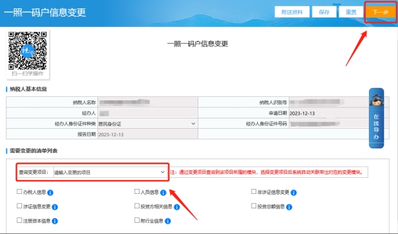 三、一照一碼戶(hù)登記信息變更頁(yè)面,在查詢(xún)變更項(xiàng)目中找相應(yīng)人員的移動(dòng)電話(huà),填寫(xiě)變更后內(nèi)容,點(diǎn)擊下一步提交即可。