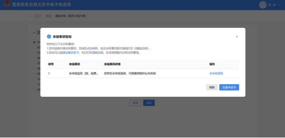?、倌蛇x擇辦理未結(jié)事項(xiàng),完成后點(diǎn)擊刷新,如無未結(jié)事項(xiàng)即可直接打印《清稅證明》; ②您也可以選擇簽署承諾書,先行打印清稅證明,在承諾期限內(nèi)辦結(jié)未結(jié)事項(xiàng)。納稅人采用承諾注銷打印清稅證明后,未辦結(jié)事項(xiàng)可以通過登錄電子稅務(wù)局進(jìn)入該功能“未辦結(jié)事項(xiàng)告知”辦理。