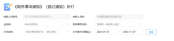 三、《稅務事項通知》(登記通知)補打界面,文書制作日期起:選擇一般納稅人生效年份的1月1日,文書制作日期止:選擇生效日期同年的12月31號(例:一般納稅人有效期起是2020-6-1,文書制作日期起是2020-1-1,文書制作日期止是2020-12-31)。
