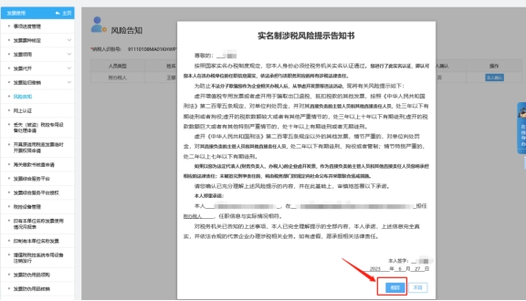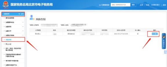 二、發(fā)票使用—風(fēng)險(xiǎn)告知,進(jìn)入雙向?qū)嵜J(rèn)證模塊(此處只顯示當(dāng)前登錄人員的信息,所以需要給誰做雙向?qū)嵜J(rèn)證,則需要使用該人員的信息驗(yàn)證登錄),點(diǎn)擊【本人確認(rèn)】。